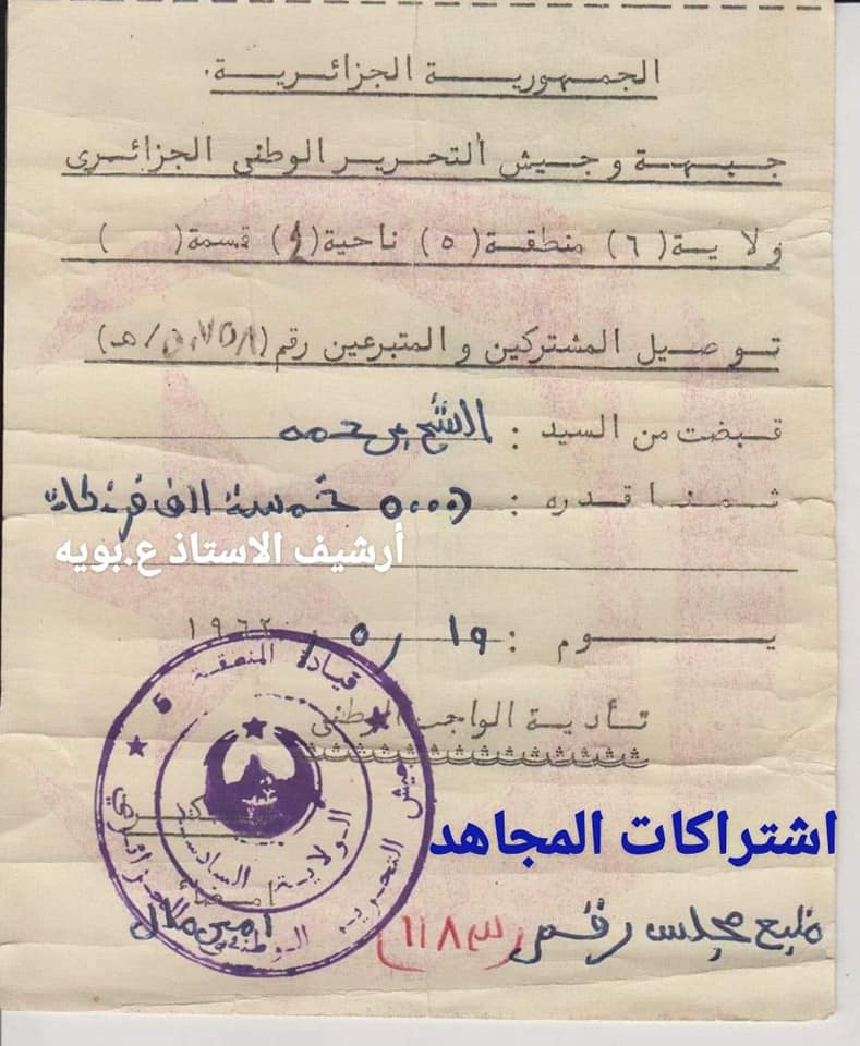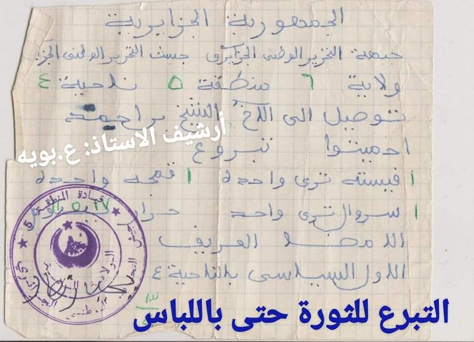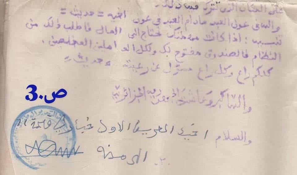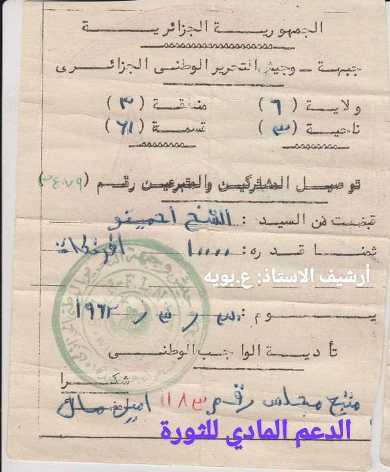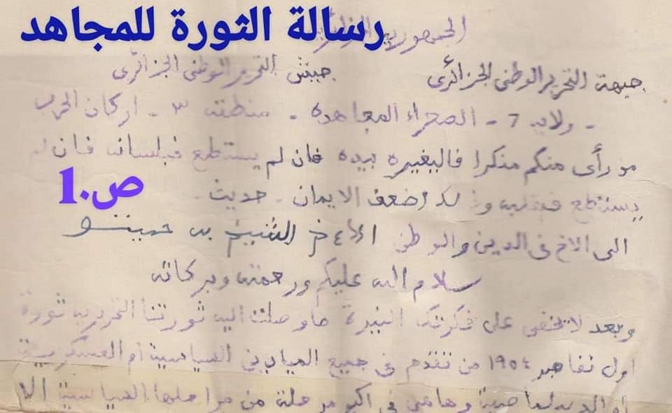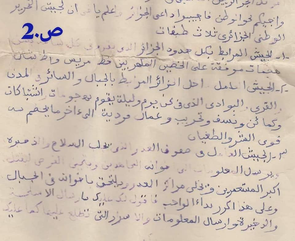 ـ3 — الجيش العامل في صفوف العدو الذي يجلب السلاح والذخيرة ويرسل المعلومات إلى اخوانه المجاهدين ويتحين الفرص ليقتل اكبر المستعمرين … كما اذا خرجت مع العدو للبحث عن المجاهدين او العاملين فعليك بتدويخ العدو في الاتجاهات عندما ترى المجاهدين او اثرهم او اماكنهم السرية حيث توجهه إلى اماكن اخرى بعيدة عن ما ذكر واذا ما وقع اشتباك فتأخر ولا تتقدم لان المجاهدين يخشون ان يقتلوا اخوانهم الجزائرين بل يحبون ان يقتلوا الاستعمار والمستعمرين، كما اذا اغتنمت الفرص لضرب المستعمرين وقتلهم فلا تتوانى في ذلك بل حطم كل قواهم فذلك جهاد أكبر وكلما ترى المكان الخفي فضع فيه الذخيرة والسلاح فالمجاهدون يلتقطونه او الشعب كذلك يلتقطه ويبلغه إلى ابناء جيش التحرير والا فاخبر العاملين على المكان الذي تترك فيه ذلك، والله في عون العبد مادام العبد في عون أخيه، استجاب رحمه الله لنداء الثورة فبذل المال وكل ما يملك من أجل إنجاح الثورة كما تبرزه الوثائق التي خلفها والتي قبل أن تكون أدلة إثبات عن جهاد وتضحيات الرجل هي دليل ساطع على عبقرية الثورة وشموليتها ودليل مادي على مشاركة منطقتنا، انتقل المجاهد الى جوار ربه في غرة نوفمبر سنة 2015